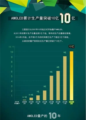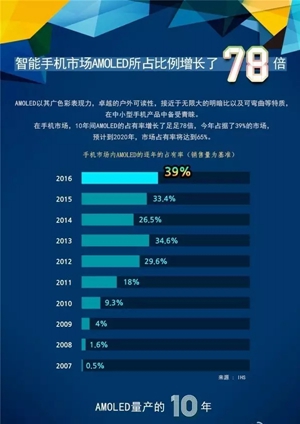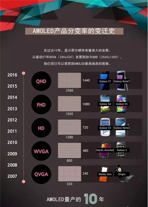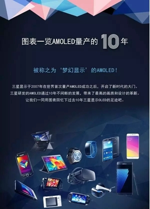 AMOLED屏幕是三星自家生產的OLED屏幕對外宣傳時所采用的名稱,從2007年三星首度量產AMOLED屏幕成功之后,與TFT LCD屏幕采用不同發光方式的OLED就愈發受到智能設備的歡迎,尤其是由于其顯示黑色時的省電特性,也被不少的智能設備所采用。