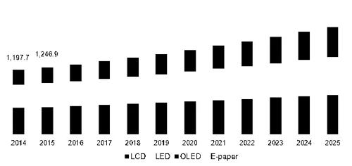 根據(jù)最新數(shù)據(jù)顯示,全球顯示市場預(yù)計(jì)將從2015年的1064.1億美元增長到2022年的1691.7億美元,2016年到2022年,年均復(fù)合增長率達(dá)7.5%。柔性顯示面板市場的高速增長、對(duì)OLED設(shè)備需求的不斷增長以及節(jié)能、有吸引力和高規(guī)格顯示產(chǎn)品的開發(fā)預(yù)計(jì)將成為市場增長的主要推動(dòng)力。