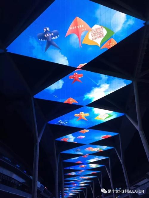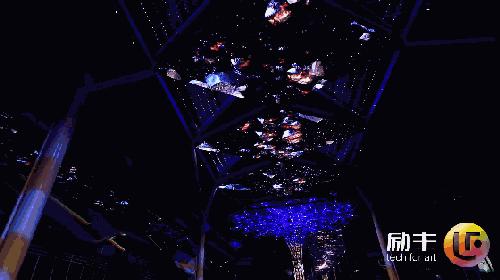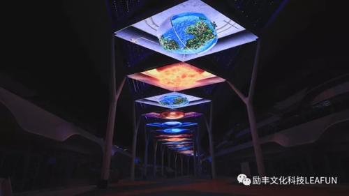 白天,由于透明異形屏具有通透性,游客在觀看影像同時還能看到藍天白云。夜幕降臨之時,一場奇幻之旅隨之開啟——華麗天幕之上,時而宇宙浩瀚、群星閃耀,時而繽紛海底、魚群穿梭,時而百花綻放、百鳥齊鳴……抬頭向上看,宛若一條時光隧道由此打開。時空變幻、光影交錯、聲樂環繞,猶如觀看科幻大片般。