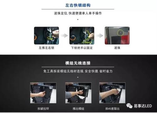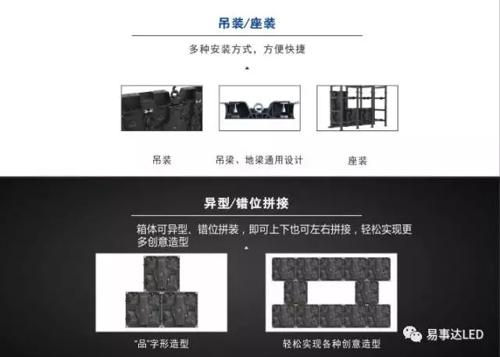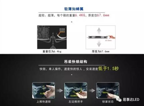 此款產品采用超輕薄設計,6.4KG重,6.7cm厚,外觀簡約時尚,而內在豐富;模組使用無線連接,安全穩定;將信號接口外露,減少了轉接帶來的不良影響;采用磁吸結構,減少拆裝的時間,方便快捷;箱體可異型、錯位拼裝,能實現更多創意造型;快鎖,單人操作,速度快的驚人。