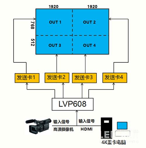 使用一臺(tái)LVP608將大屏分成4塊小屏做拼接,用4K顯卡高清輸入接口,每個(gè)DVI輸出口都是以4K分辨率進(jìn)行處理拼接,最后同步到點(diǎn)對(duì)點(diǎn)顯示到LED屏幕上。