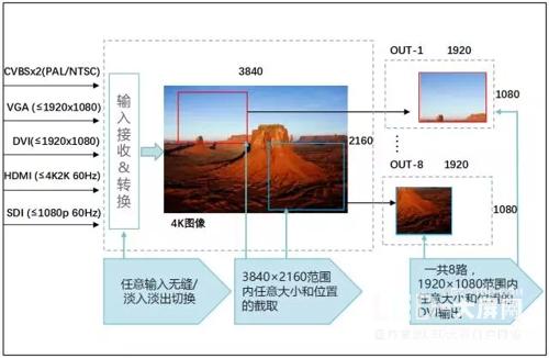 LVP609的任意輸出端口可以截取4K2K 60Hz輸入圖像的任意大小和位置