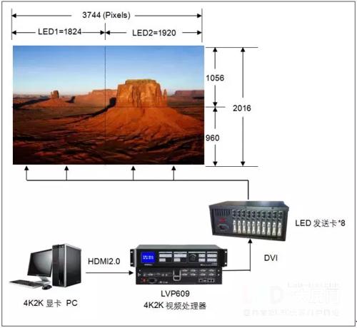 led大屏幕像素點陣為3840×2016,分成4塊LED小屏,使用4套發送卡控制,像素點陣分別是:
