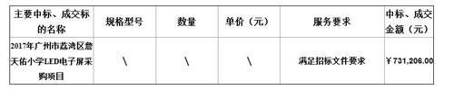 廣州有德招標代理有限公司受廣州市荔灣區詹天佑小學的委托,于2017 年04月19 日就2017年荔灣區詹天佑小學LED電子屏采購項目(440103-201704-101137-0001)采用公開招標進行采購,F就本次采購的中標(成交)結果公告如下: