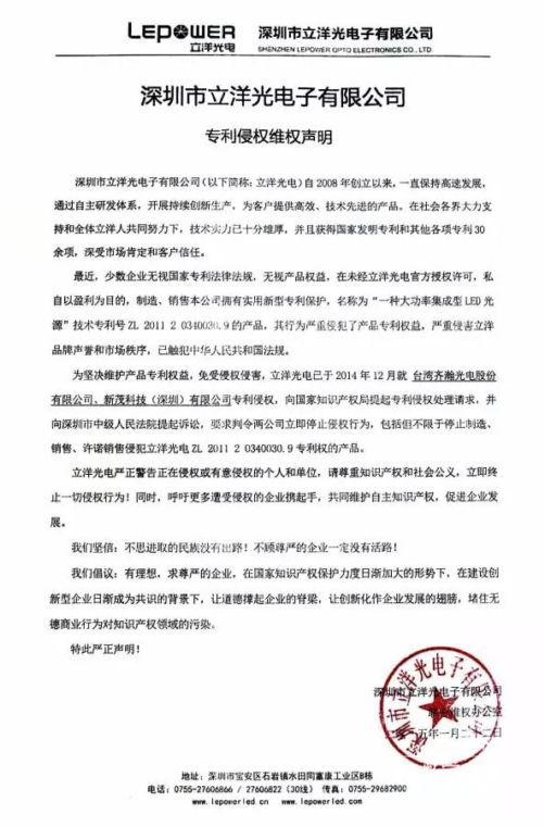 2014年12月,立洋光電控訴臺灣齊瀚光電股份有限公司、新茂科技(深圳)有限公司侵犯其ZL 2011 2 0340030.9專利權。值得一提的是,齊瀚此前還曾遭臺灣LED封裝廠研晶光電指控違反營業秘密法。