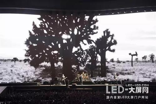 舞臺寬200英尺,深40英尺,幾乎等同于場館的總寬度。舞臺背景是巡演史上使用過最大、最清晰、分辨率最高的LED電子屏(約8k)。這塊寬200英尺,高45英尺的定制屏幕像一張巨型金色卡片,銀色的約書亞之樹標志繪制其上。樹從屏幕的邊緣伸展而出,成為整場演出的中心焦點。