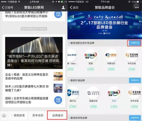 關(guān)注“慧聰LED屏網(wǎng)”微信公眾賬號,點(diǎn)擊下方自定義菜單欄“品牌盛會”,即可進(jìn)入報(bào)名頁面。