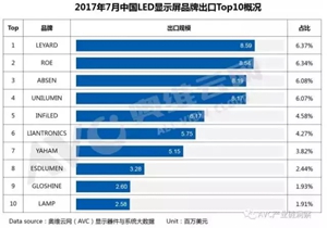 據《中國led顯示屏出口月度數據報告》顯示,2017年7月我國led顯示屏產品實現1.35億美元的出口規模。其中,top10廠商出口金額為0.59億美元,占行業月度出口規模的43.8%,出口市場競爭較為激烈。