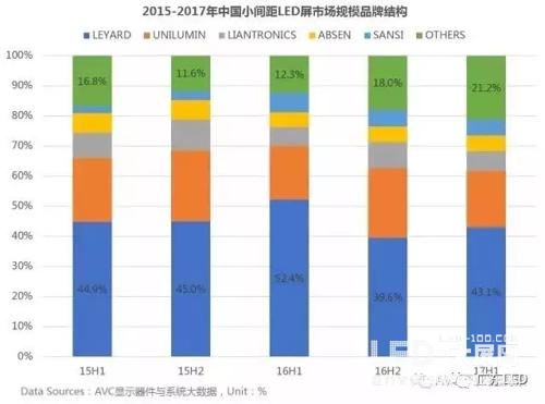 從市場品牌分布數據分析,龍頭企業利亞德今年上半年貢獻43.1%份額,洲明科技約為18.6%,而其他廠商占比逐漸上升,達21.2%,主要表現為越來越多的廠商加入到小間距LED市場競爭。業內人士預計未來兩三年,在LED顯示行業中,將出現1-2家收入達到甚至超過50億元的企業。