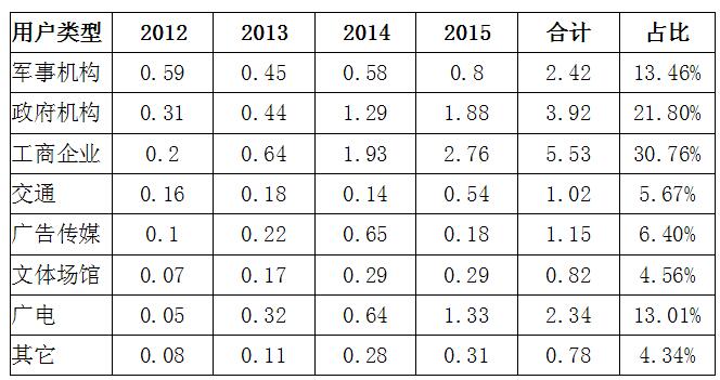 利亞德2012-2015年小間距電視用戶分布表(數據單位:億元)