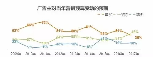 根據(jù)CTR《2017年廣告主調(diào)查報(bào)告》顯示,2017年計(jì)劃增加營銷預(yù)算的廣告主占比為九年來的最低值,只有36%。從廣告主對于今年?duì)I銷預(yù)算的增減狀態(tài)看,今年廣告主更傾向于維持去年的營銷預(yù)算費(fèi)用。