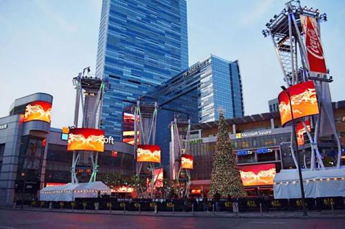 泛海廣場(Oceanwide Plaza)的兩邊各矗立著我們之前的2個項目。它的左側(cè)是2016年三思制造的10塊LED戶外廣告牌,它被設(shè)計成具有后現(xiàn)代風格的塔柱,十分標新立異。它的右側(cè)是2017年三思制造的全彩戶外LED廣告屏(安裝中),1700平方米的面積同樣令人搶眼。