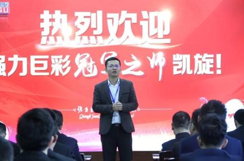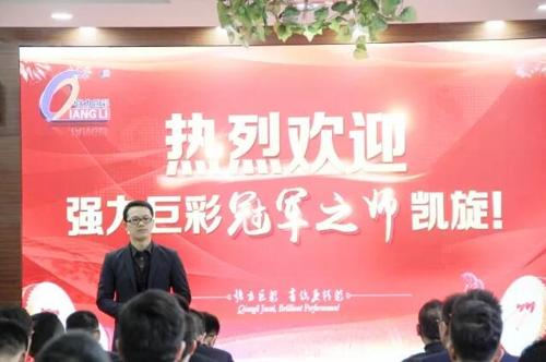 接著,載譽(yù)榮歸的冠軍之師迅速列隊(duì)整齊以待,強(qiáng)力巨彩董事長(zhǎng)朱志強(qiáng)先生、營(yíng)銷事業(yè)部代理總經(jīng)理?xiàng)铠欃F先生以及各中心負(fù)責(zé)人親臨迎接,舉辦了隆重的歡迎儀式。