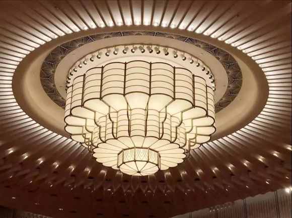 國家會議中心會場吊頂造型展現鮮花盛開的形態,中心有一枚銅藝花燈,取義“綻放”。燈光呈現圓環形態,形成“天圓地方”的格局。