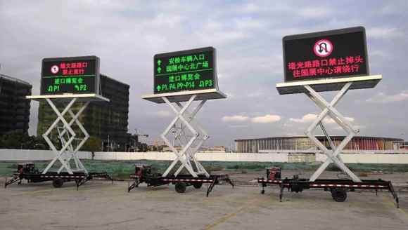 新增情報板在關鍵節點前對備選路徑進行提示,引導車流避開擁堵節點和管制路段,提前均衡車流,分散進入國家會展中心周邊區域。不僅增加了固定懸吊式交通誘導屏,市交委還特設了移動式交通誘導屏,根據道路交通和人流實際狀況,進行可移動的指引,這對交通誘導屏的綜合技術提出了更好的要求。