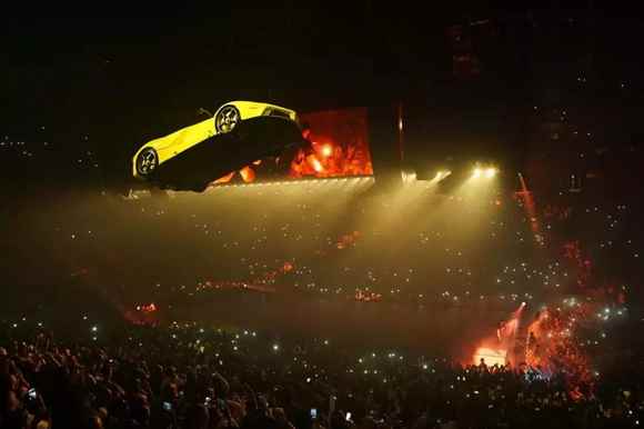 說唱歌手站在高高的舞臺(tái)上,裝飾著成千上萬的小型燈具,舞臺(tái)視覺上還有巨大的蝎子、太陽系、熔巖,微型無人機(jī)群和真黃色法拉利飛車。加上巨大的LED屏幕和BlackTrax追蹤技術(shù),燈光和視覺內(nèi)容配合著他的一舉一動(dòng),給現(xiàn)場粉絲們帶來一生一次、絕無僅有的視聽體驗(yàn)。在表演中場時(shí),Drake的視覺舞臺(tái)通過投影+激光的互動(dòng)形式讓舞臺(tái)變成了一個(gè)籃球場,籃球架則降落到舞臺(tái)上。隨著場上籃球場的線條被點(diǎn)亮,他們甚至中途還來了個(gè)投籃比賽。