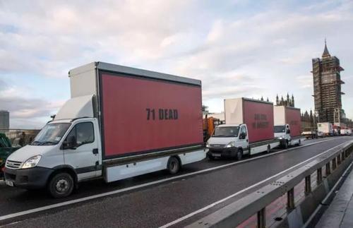 2 月 15 日,在去年 6 月發生火災的倫敦格倫費爾塔下出現了三輛安裝廣告牌的廂式貨車,車身上的紅底黑字寫著:“死亡 71 人”、“至今無一人被逮捕”、“為什么?”