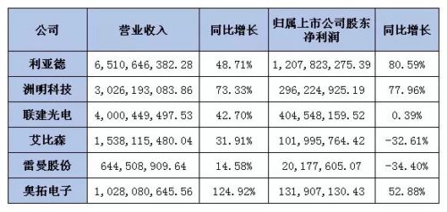 聯(lián)建光電2017年營業(yè)總收入4,000,449,497.53元,同比增長42.70%;營業(yè)利潤-179,595,657.39元,同比減少139.71%;利潤總額478,777,104.62元,比上年同期增長1.34%;歸屬于上市公司股東的凈利潤404,548,159.52元,比上年同期增長0.39%。