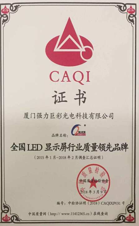 作為中國光學光電子行業協會、福建省及廈門市光電協會會員和廈門市高新技術協會常務理事單位,強力巨彩獲得了2011-2012年度十佳LED顯示應用工程、中國LED行業十強企業、2012年度廈門市最具成長性企業、節能減排優秀企業、納稅明星企業以及安全生產先進單位和國家火炬項目證書等多項榮譽稱號。另外,強力巨彩先后通過了OHSAS18000、ISO14000、ISO9000認證。產品獲得CE、RoHS和CCC等認證,并獲得了室內、戶外多項產品專利。