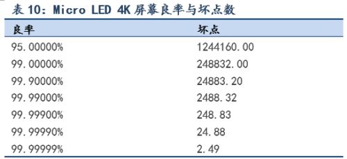 此外,千萬級的RGB像素也給轉移過程中的良率控制帶來了很大的挑戰。仍以4K屏幕為例,為了將壞點控制在兩位數以內,轉移的良率需要提高到99.9999%,這就需要Micro LED制程的設備的精密度需降到±0.5μm。但目前現況轉移設備(Pick & Place)的精密度是±34μm (Multi-chipper Transfer),覆晶固晶機(Flip Chip Bonder)的精密度是±1.5μm (每次移轉為單一芯片) ,皆無法達到Micro LED巨量轉移的精密度規格需求。