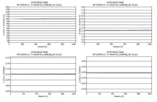 歐司朗光電半導體所有led顯示屏應用的LED產品,都能提供詳盡的可靠性測試報告。報告內容不只是提供“死燈”率,而是通過在每項測試中LED關鍵規格隨時間變化的曲線(如圖十所示,產品LRTB GRUG在高溫高濕1000小時的測試中,亮度、電壓和色點隨時間的變化曲線)。