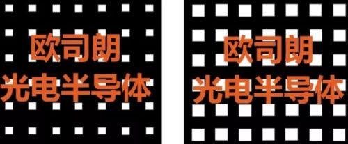 在觀測距離足夠大的情況下,LED發光面在總個顯示面積中的占據比例將會影響屏幕的對比度。由于LED與LED之間的空間會由面罩占據,而即使是最黑的LED,表明反光率也會比面罩高,所以,LED發光面在總個顯示面積中的占據比例越高,屏幕的對比度就越低。圖八為相同點間距、不同LED尺寸的顯示示意對比。
