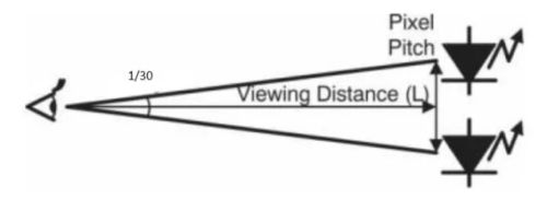 當觀測距離(L)是10米時,點間距的極限(Dpp)就是5.8mm。更高的像素密度將是沒有意義的。