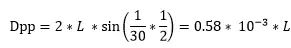 人眼能夠分辨兩個點光源的極限是這兩個點光源和人眼形成1/60的弧度角,那么該兩點的距離(Dpp)和觀測距離(L)就有如下關系: