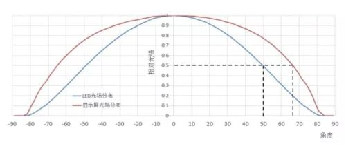 LED本身的視角也是基于以上同樣的定義。而由于顯示屏上的亮度測試的定義,光探頭至少需要包換16個LED像素點,會導致屏的視角會比所使用的LED的視角稍大的現象(假設面罩無擋光)。如圖三所示的例子,由100度視角LED所做成的led顯示屏有134度的可視角。