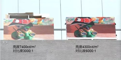 根據行業標準SJ/T11281-2007《發光二極管(LED)顯示屏測試方法》的定義,顯示屏在一定的環境照度下,其最大亮度與背景亮度之比稱為最高對比度(具體測試條件和方法見該標準)。例如一個屏幕在全白屏狀態時候亮度為5000cd/m2,全黑屏狀態亮度為1cd/m2,這樣屏幕的對比度就是4999:1。對比度的定義其實強調了在使用環境中,顯示畫面的可辨識程度,相對于亮度指標,對比度指標增加對全黑屏狀態下的亮度考察,而全黑屏狀態下的亮度又與環境光和屏幕本體(LED和面罩)的反光屬性密切相關。以下戶外的對比實例可以看出,亮度高而對比度低的屏幕反而沒有亮度相對低而對比度高的屏幕效果好。