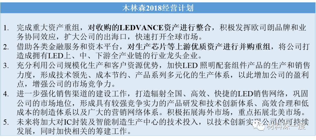 2018年,公司將繼續(xù)立足主業(yè)、持續(xù)創(chuàng)新,加大產(chǎn)品研究開發(fā)力度;完成公司的并購重組業(yè)務(wù),推動國內(nèi)外市場業(yè)務(wù)的聯(lián)動發(fā)展,并借助各類金融服務(wù)和資本平臺,把握行業(yè)發(fā)展機(jī)遇,將木林森打造成為集LED芯片生產(chǎn)、封裝及應(yīng)用照明產(chǎn)品為一體的具有國際競爭力的LED生產(chǎn)企業(yè)。