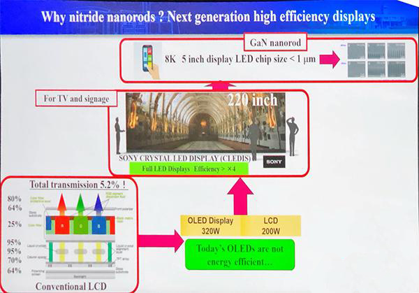 天野浩教授本次分享的內容除了未來LED在各種節能領域的應用前景之外,針對顯示器領域,也特別探討了Nanorods LED,認為該技術未來將有機會成為顯示器領域當中的可能選項之一。尤其是當未來消費性電子產品的顯示器分辨率需要拉高到8K的時候,Micro LED芯片尺寸則需要小于1µm,才能夠符合手機熒幕大小,無論是用QD或是熒光粉,想要在這么小的芯片上面去涂布這些材料去作光色轉換都會面臨到相當大的技術障礙。