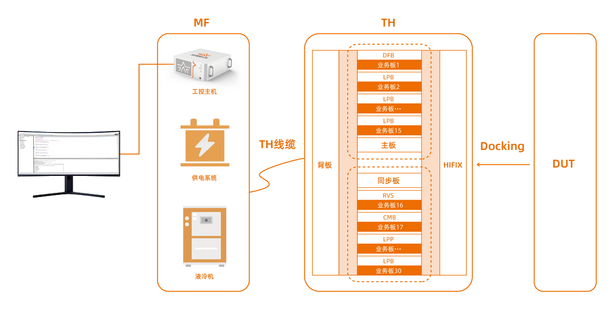 Flex10K-L測(cè)試整機(jī)包含MainFrame和TestHead兩大部分,MainFrame機(jī)柜由工控主機(jī)、供電系統(tǒng)、液冷機(jī)組成,采用液冷散熱,冷卻效果優(yōu)異,產(chǎn)品性能更加穩(wěn)定;MainFrame通過TH線纜與TestHead連接,實(shí)現(xiàn)測(cè)試程序?qū)y(cè)試機(jī)硬件資源的控制。TestHead機(jī)箱由測(cè)試板卡以及HIFIX機(jī)頭組成,最高支持30個(gè)資源槽位,配備DFB、LPB、LPP、RVS、CMB、HSIF等資源板卡,HIFIX機(jī)頭可兼容ND3針卡、ND4-C針卡,節(jié)省轉(zhuǎn)平臺(tái)治具費(fèi)用。